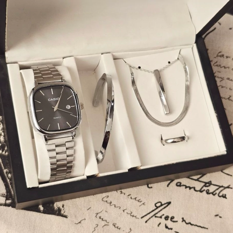 ست ساعت مردانه کاسیو با دستبند و گردنبند و حلقه کادو مردونه