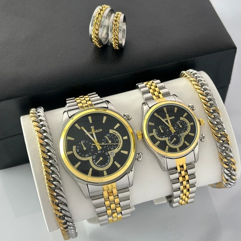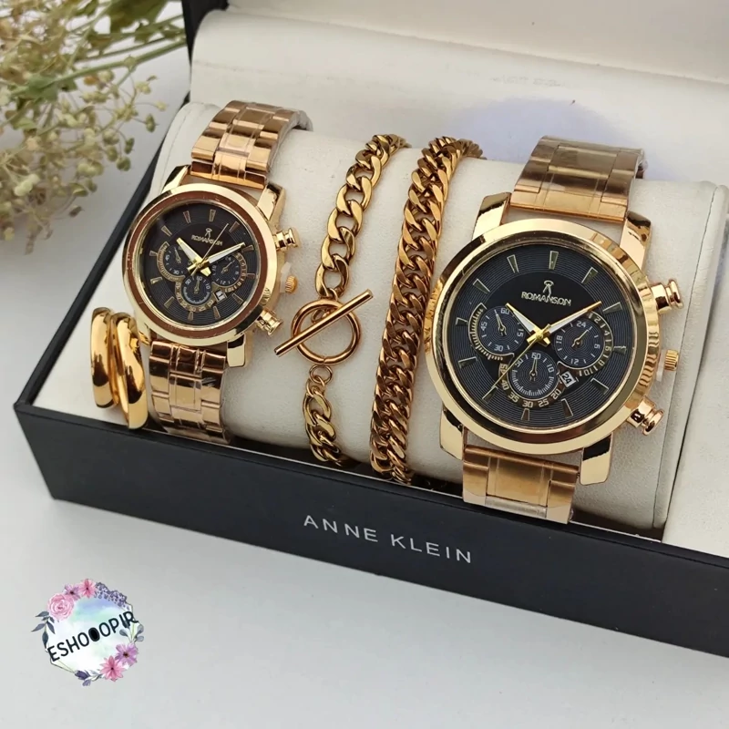 ست ساعت و دستبند زنانه و مردانه رومانسون طلایی با انگشتر با ارسال رایگان