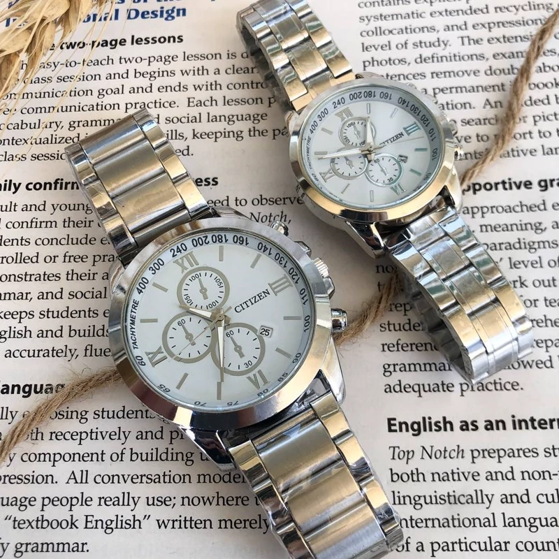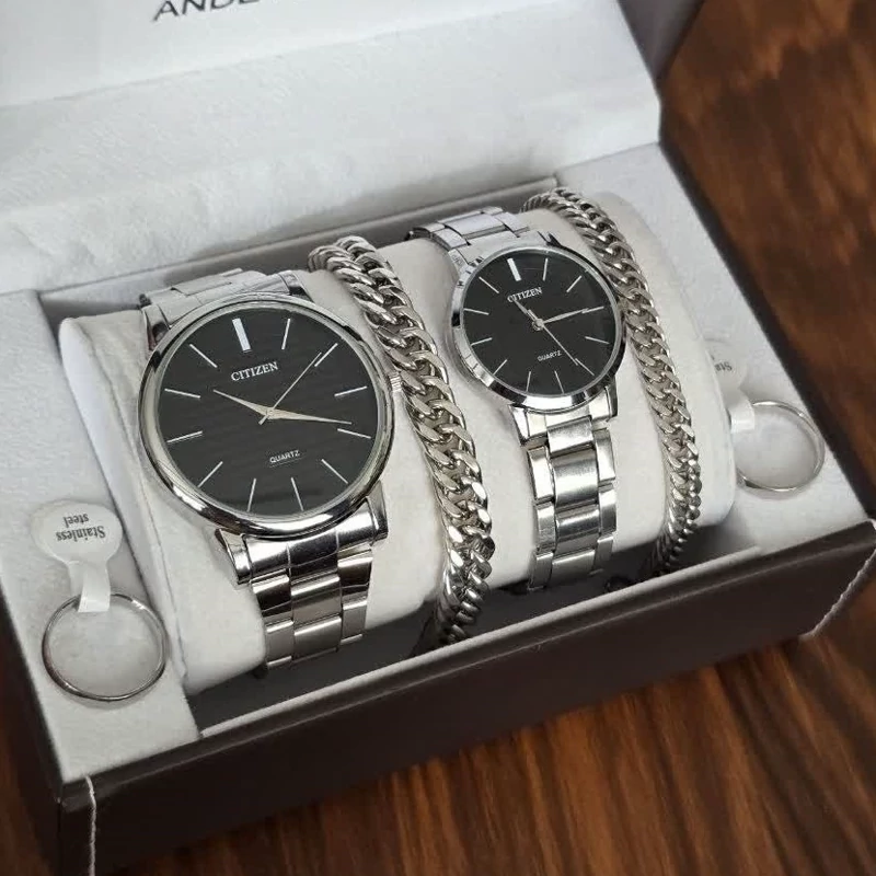 ساعت زنانه و مردانه ست با دستبند و حلقه نقره ای استیل و رنگ ثابت سیتیزن vip
