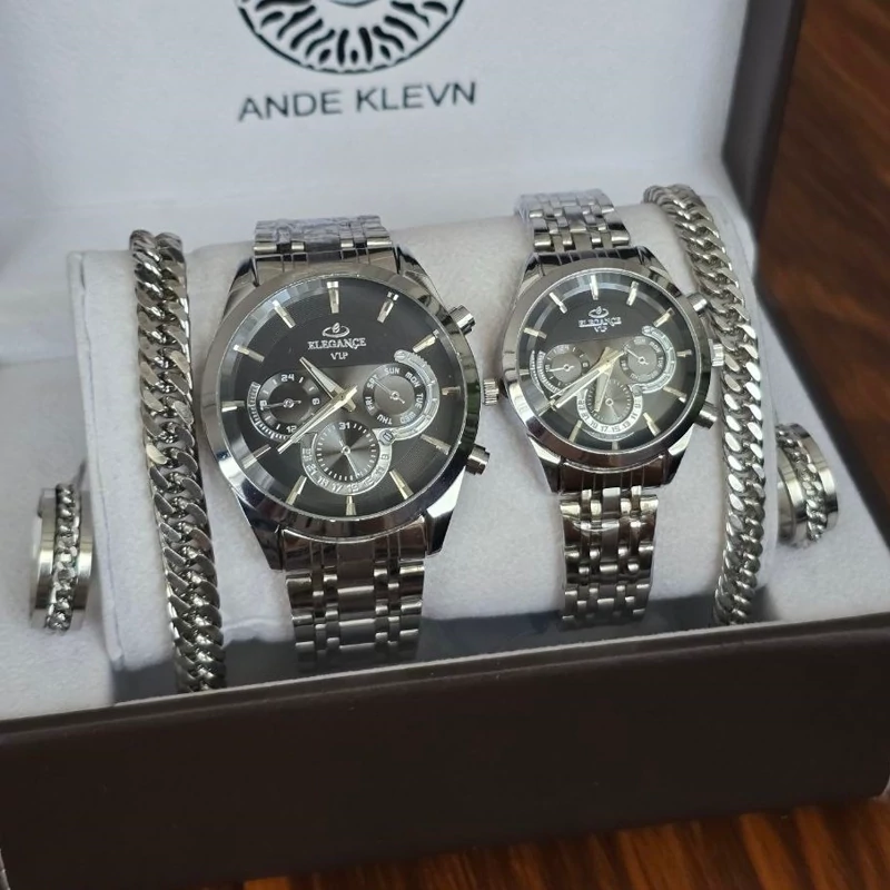 ست ساعت مردونه زنونه الگانس elegance vip بند استیل نقره ای صفحه مشکی
