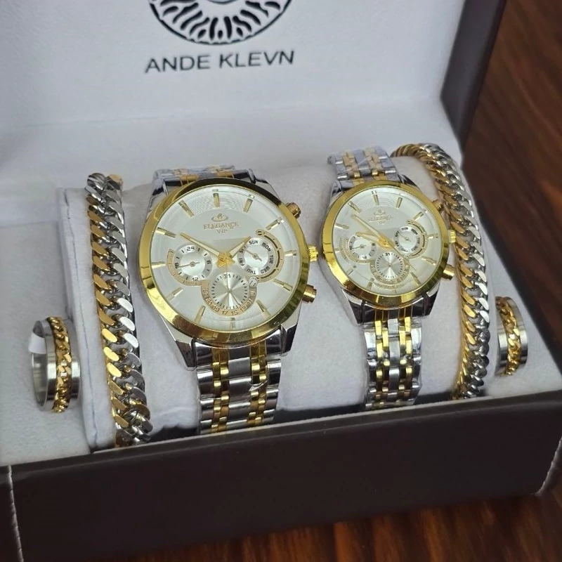 ست ساعت مردونه و زنونه الگانس با بند طلایی نقره ای و دستبند مردونه و زنونه و حلقه ست