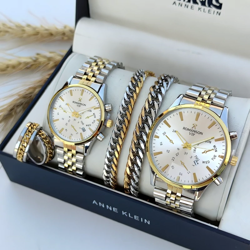 ست ساعت زنانه و مردانه رومانسون vip با دستبند و حلقه طلایی نقره ای با ارسال رایگان