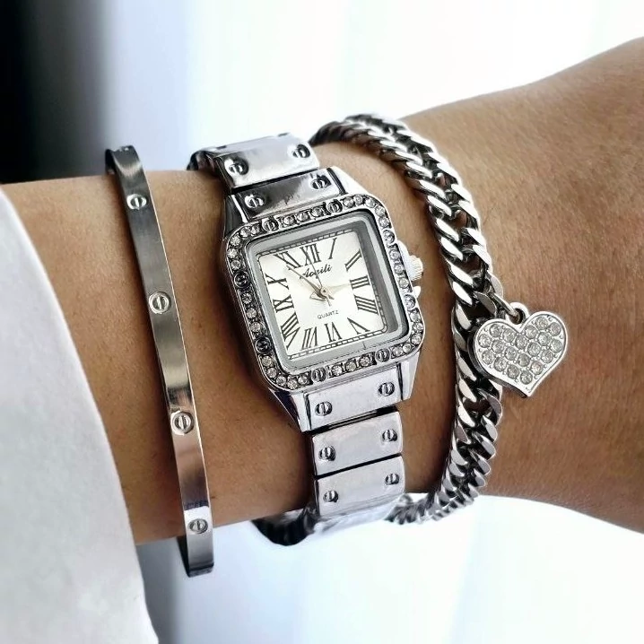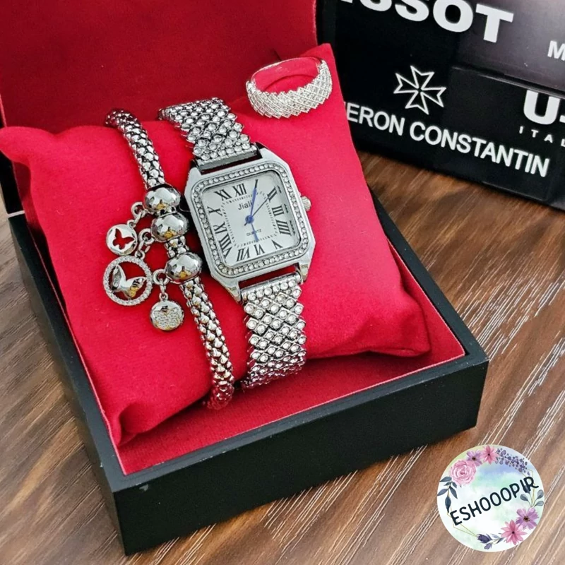 ست ساعت زنانه جواهری با دستبند و انگشتر نگین دار با جعبه شیک داخل مخمل و ارسال رایگان