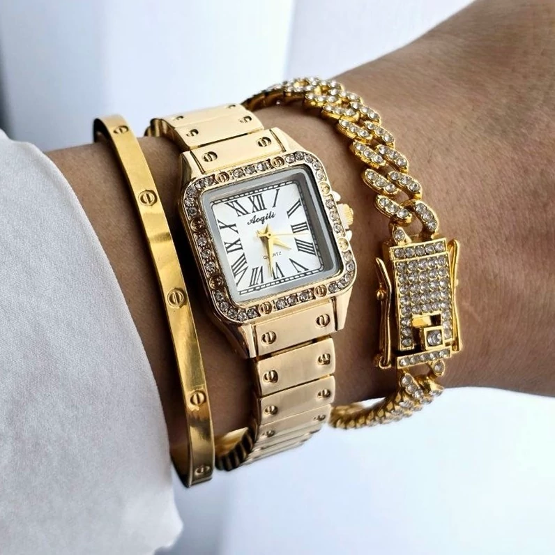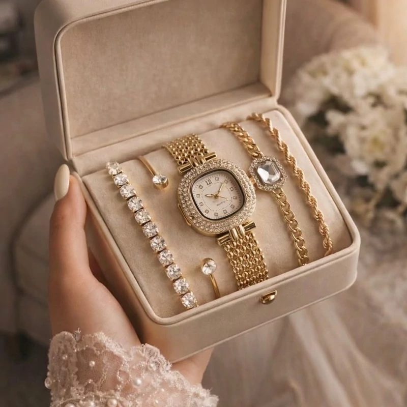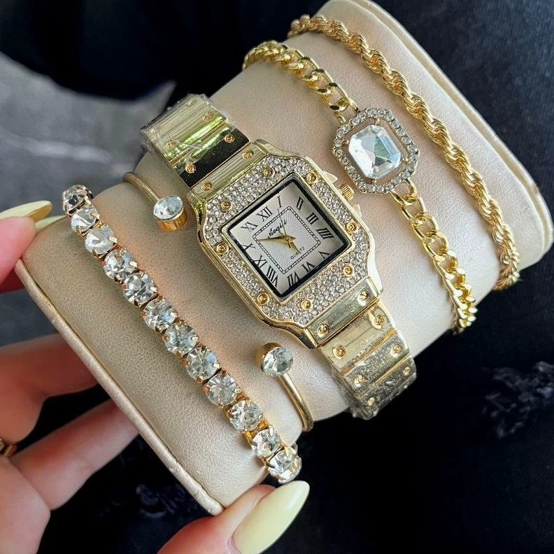 ست ساعت و دستبند زنانه دخترانه طلایی دور نگین با ست دستبند 4 تایی