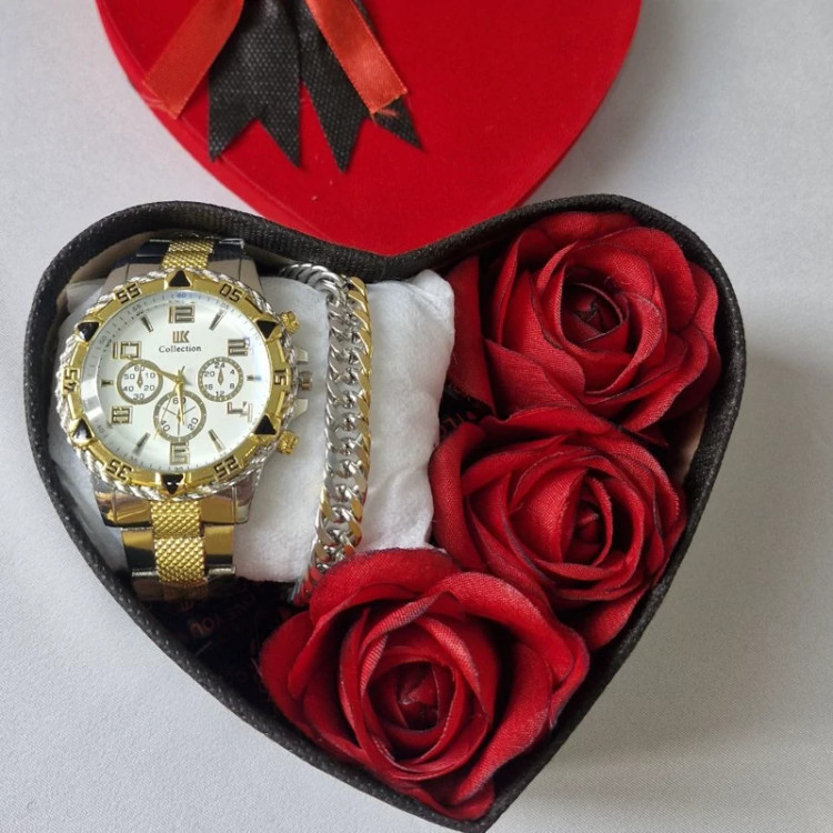 باکس کادو مردونه ساعت و دستبند با جعبه هدیه و گل