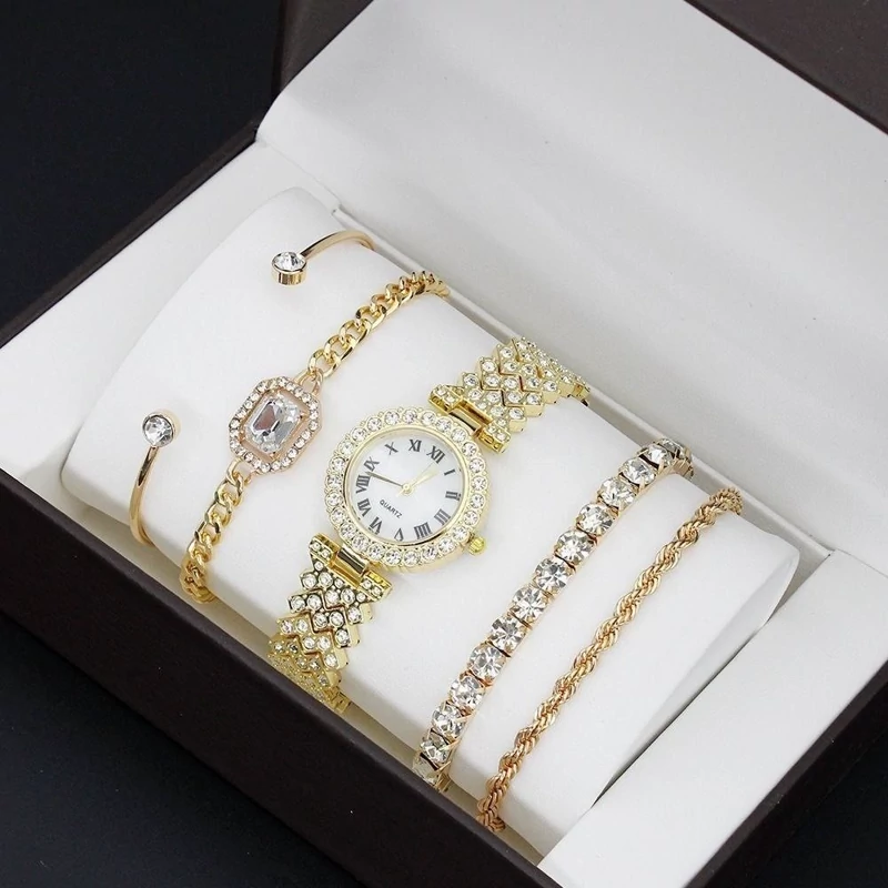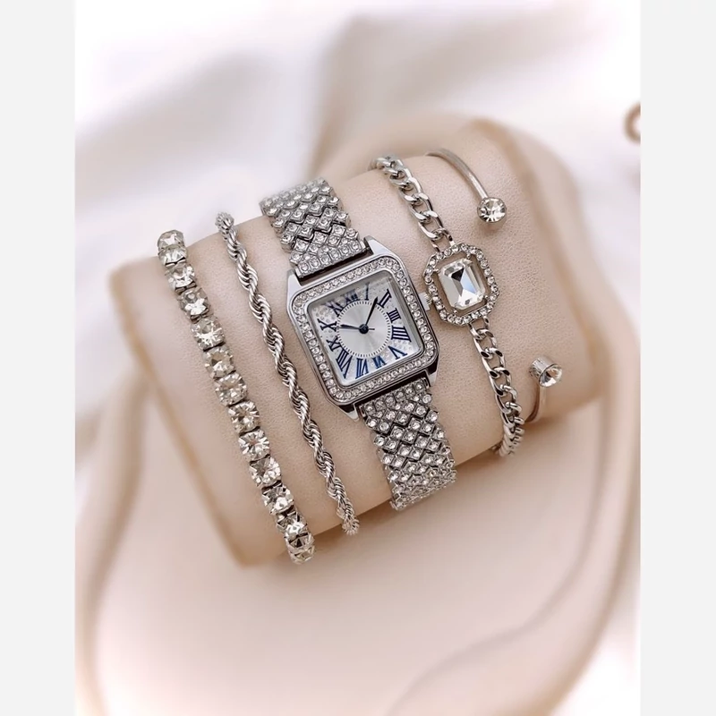 شارژ یکی از پرفروشترینها 😍 ست ساعت زنانه با بند نگین دار و 4 عدد دستنبد ست مدل یونانی قفل دستبندی قاب نگینی طرح مجلسی بند فلزی نگین دار