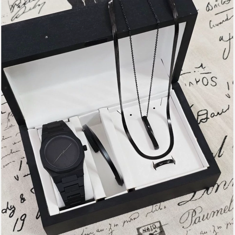 ست ساعت مردونه طرح Ap مشکی فول بلک با دستبند و گردنبند و حلقه مشکی
