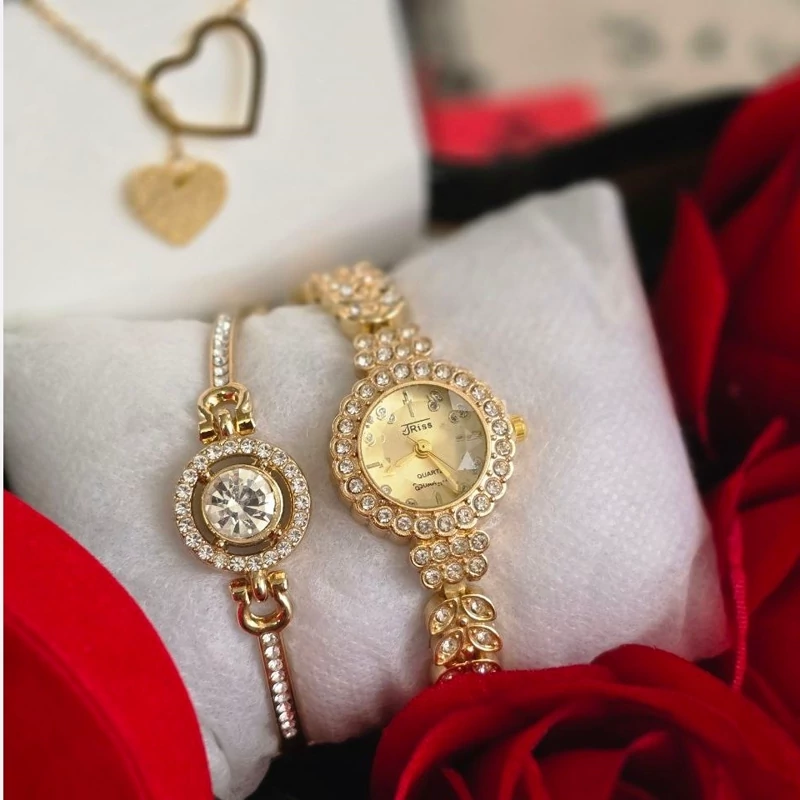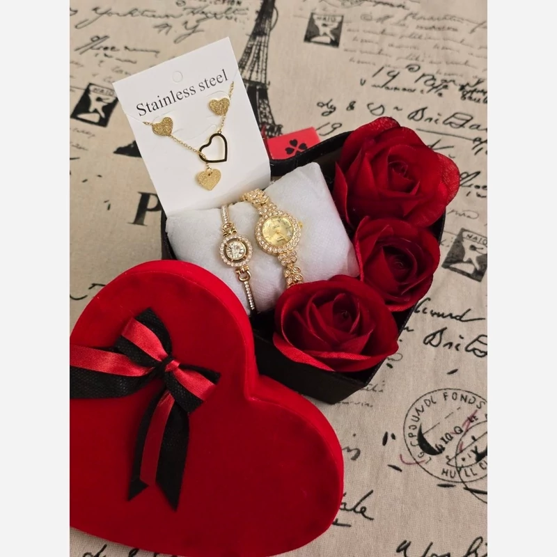 🎁 پک هدیه زنانه شامل ساعت مچی زنانه طلایی و دستبند و نیم ست استیل طلایی با باکس قلبی کادویی و گل رز و پوشال