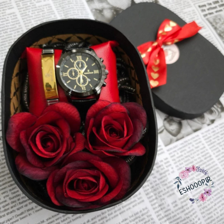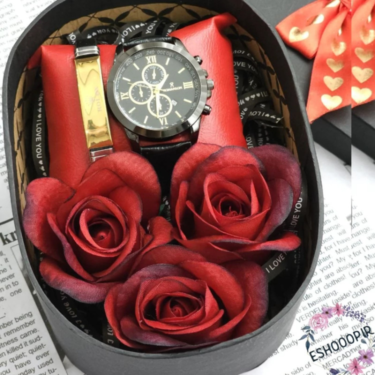 ساعت مردانه رومانسون با دستنبد و جعبه و گل مناسب هدیه روز مرد