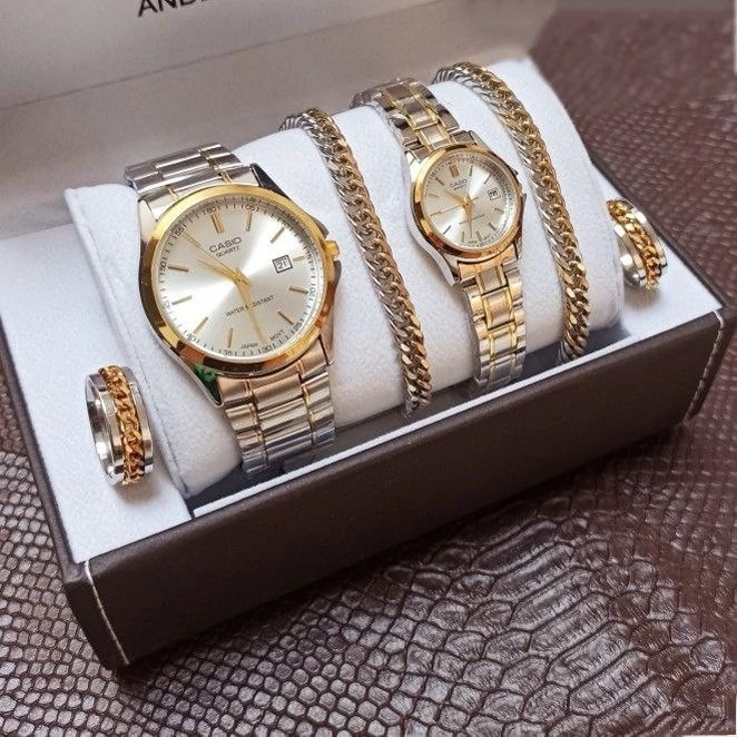ست ساعت مردانه زنانه کاسیو casio بند طلایی نقره ای استیل