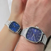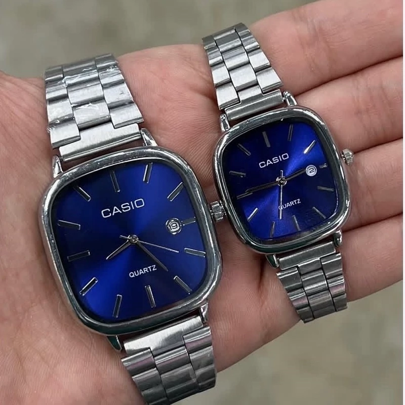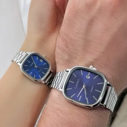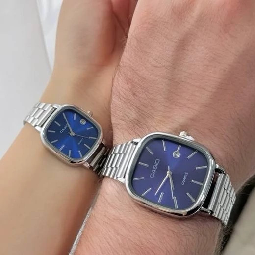 ست ساعت مردونه و زنونه کاسیو اولد مانی بند استیل نقره ای با صفحه سرمه ای