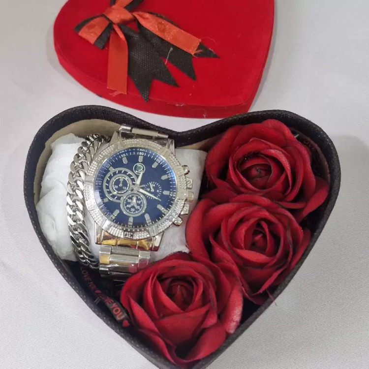 باکس کادویی مردونه ساعت و دستبند با جعبه هدیه و گل