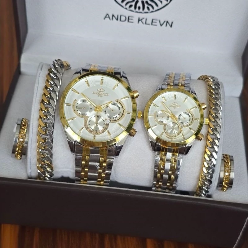 ✅️شامل دو ساعت مردانه و زنانه طلایی نقره ای با برند الگانس +