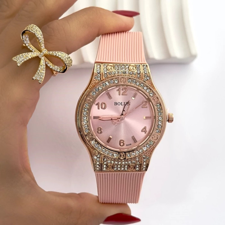 ساعت مچی زنانه دخترانه طرح هابلوت با قاب دور نگین و بند پیو سیلیکونی صورتی