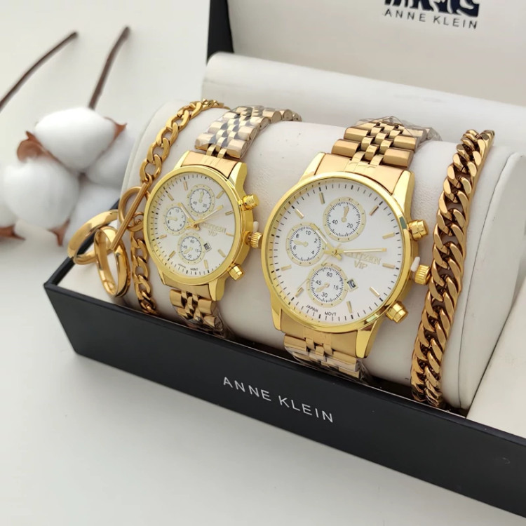 ست ساعت زنونه و مردونه سیتیزن vip طلایی با صفحه سفید با دستنبد و انگشتر ست