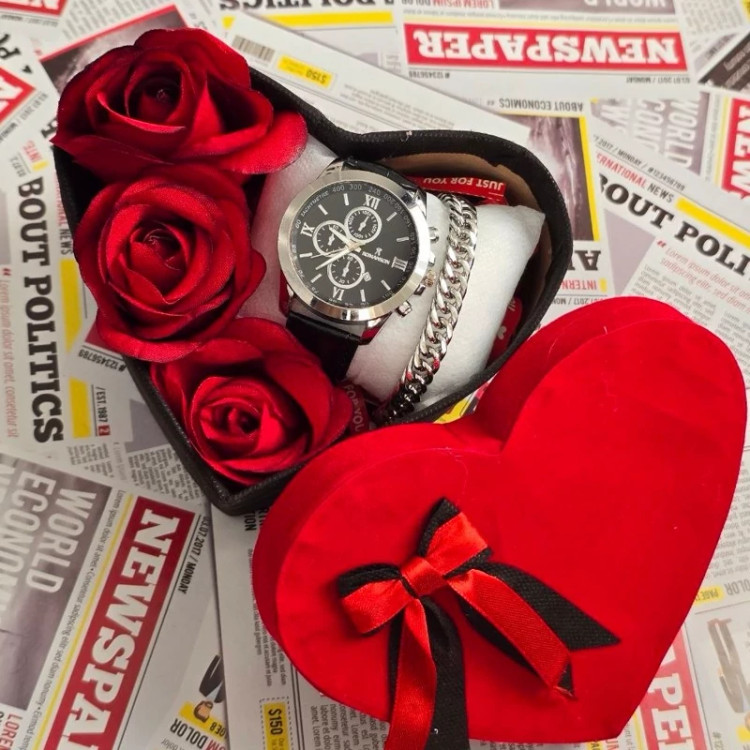 باکس هدیه ساعت مردانه رومانسون با دستنبد و جعبه و گل مناسب هدیه روز مرد