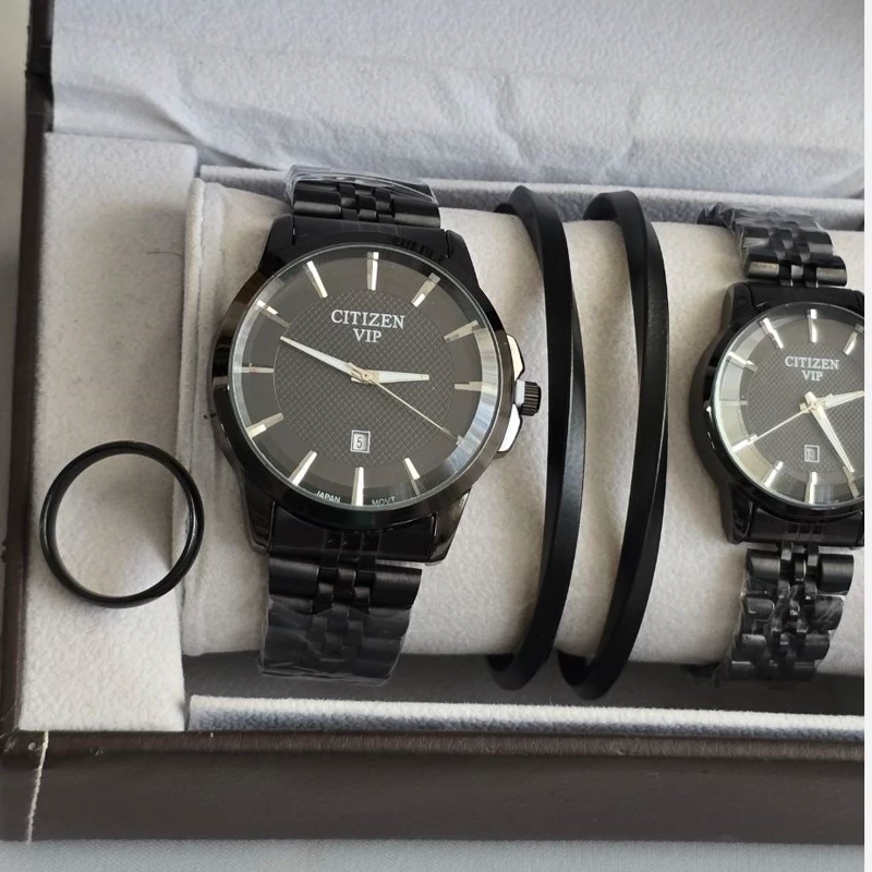 ست ساعت زنانه و مردانه سیتیزن vip بند استیل و رنگ ثابت ساعت ها دارای تقویم روزشمار دو عدد بنگل مشکی رنگ ثابت و حلقه (سایز 6 تا 10) به همراه جعبه کادویی 🎁 و باتری یدکی