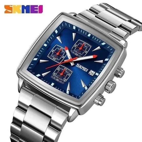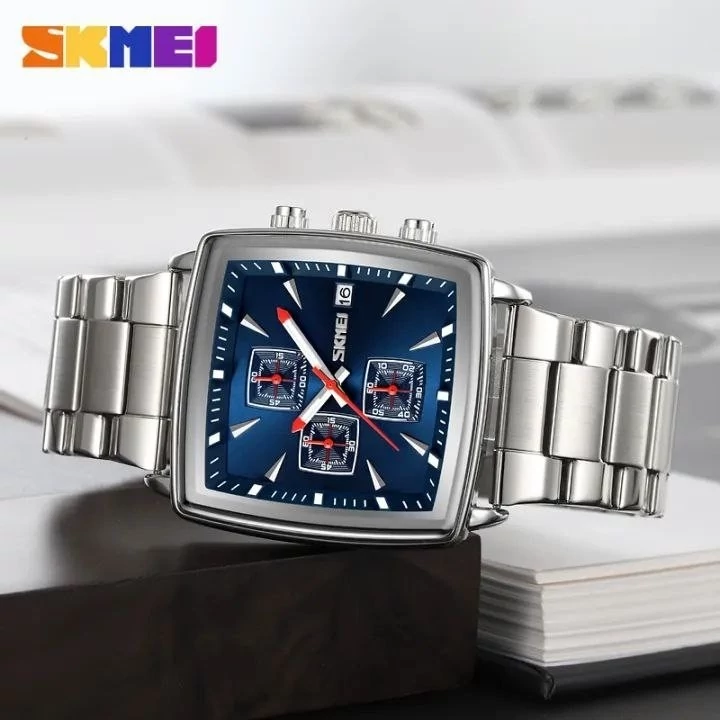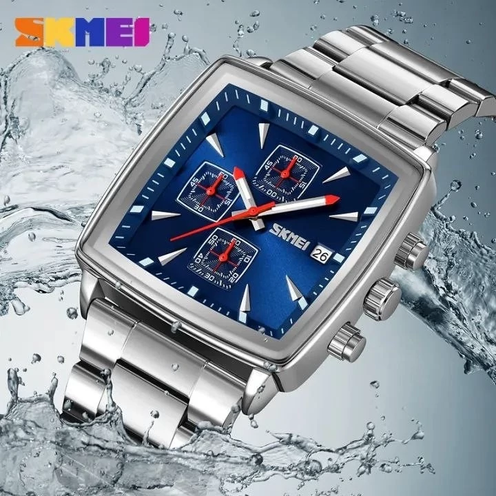 Skmei For men سه موتوره فعال برند اسکمی اورجینال قطر 40 میلی متر رنگ ثابت ضدآب قاب استیل بند استیل شیشه ضدخش روز شمار دارد ضدآب 3ATM باکس مخمل