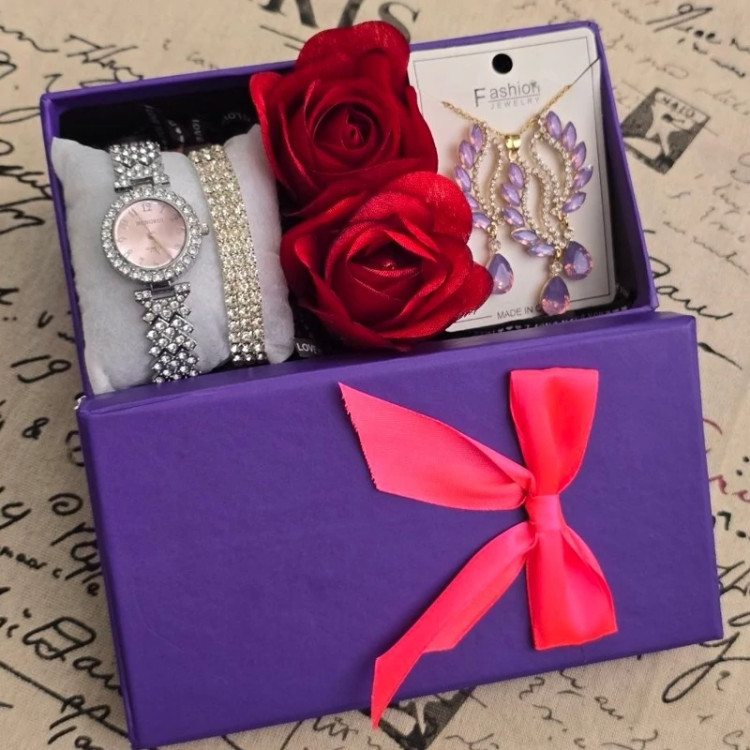 پک کادو باکس هدیه زنانه دخترانه ساعت و دستبند و نیم ست با جعبه و گل