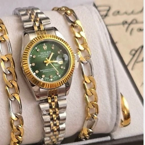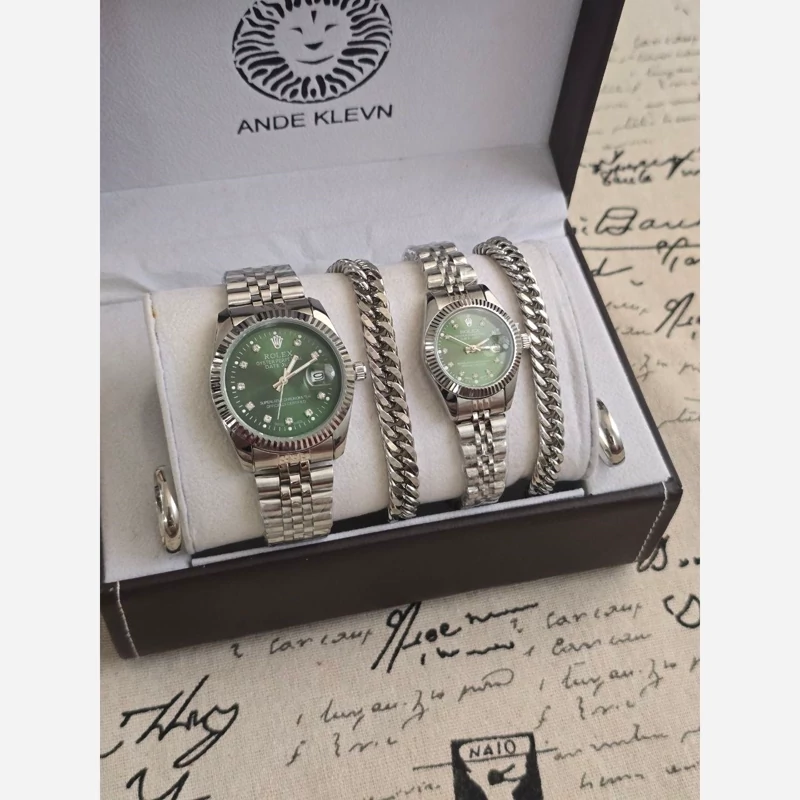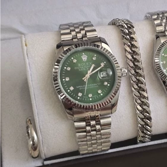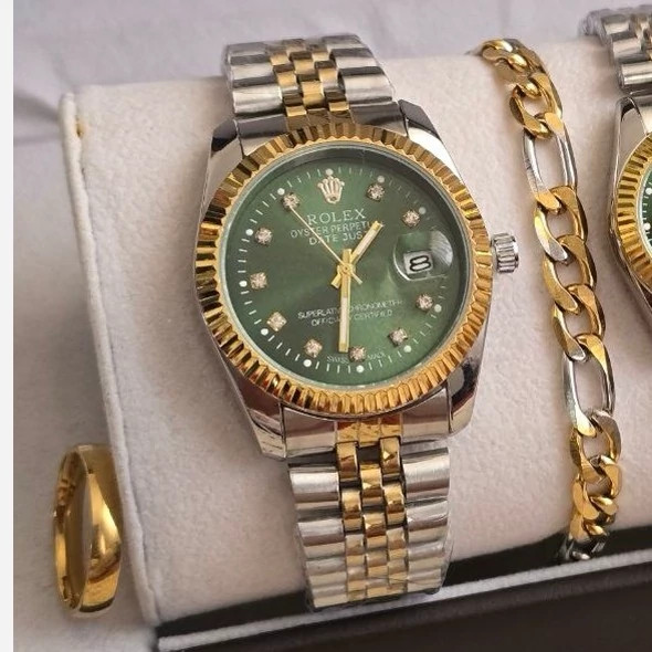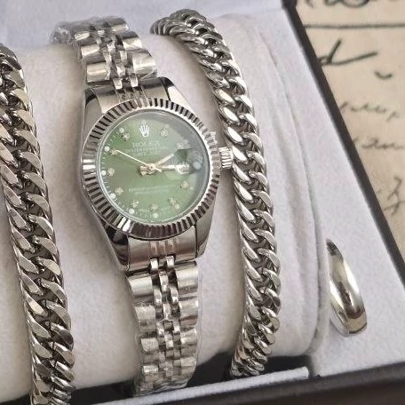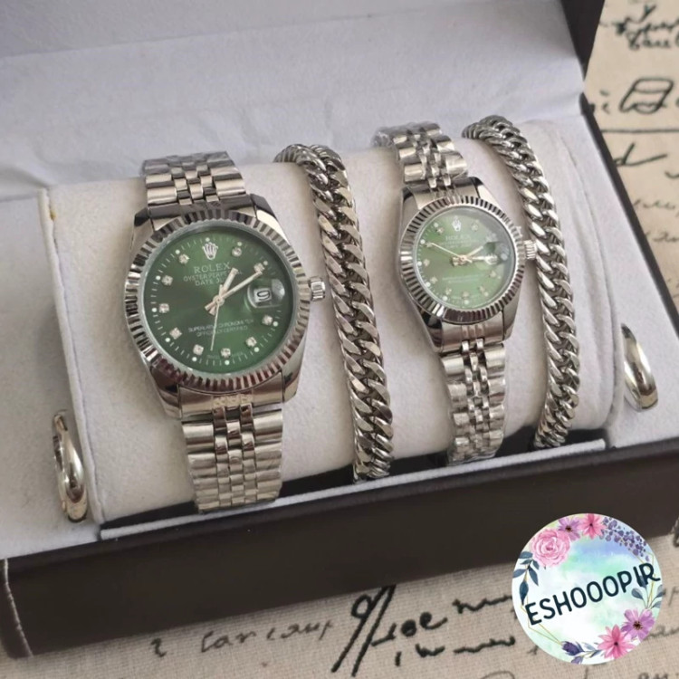 ساعت زنانه و مردانه رولکس Rolex ست با دستبند و انگشتر صفحه سبز با ارسال رایگان