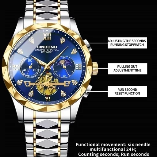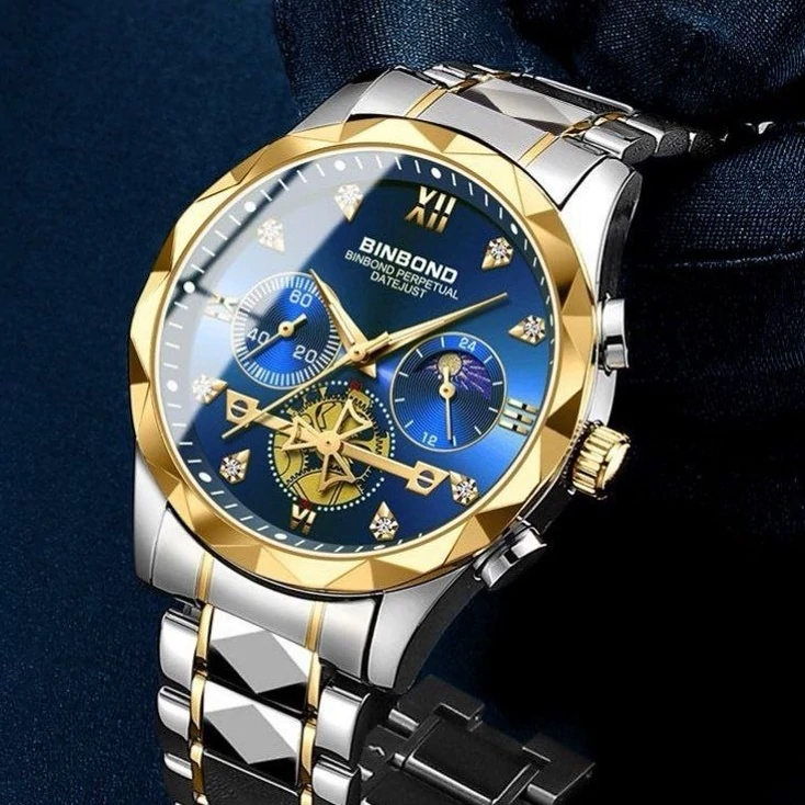 ساعت مردانه BIN BOND 《highe quality》 Original watch ⌚️بین باند مدلی نو مردونه پرطرفدار مقاوم دربرابر آب برندشرکتی اوریجینال کارت گارانتی نمایش مون استار شب نما کرنوگراف دارای روز شمار ایام هفته بند استیل فولاد شیشه سافایر قفل دو پروانه موتور کوارتز