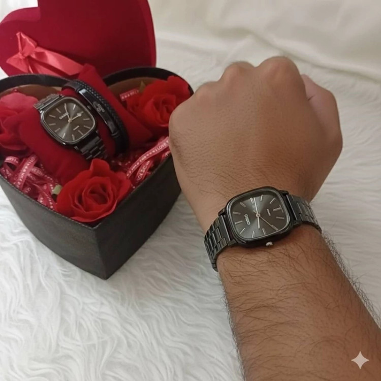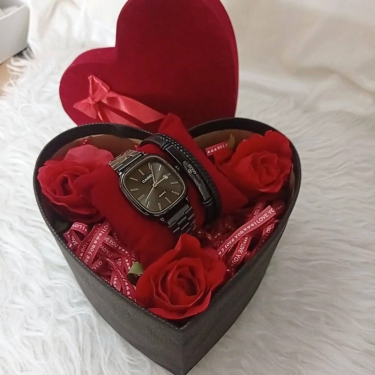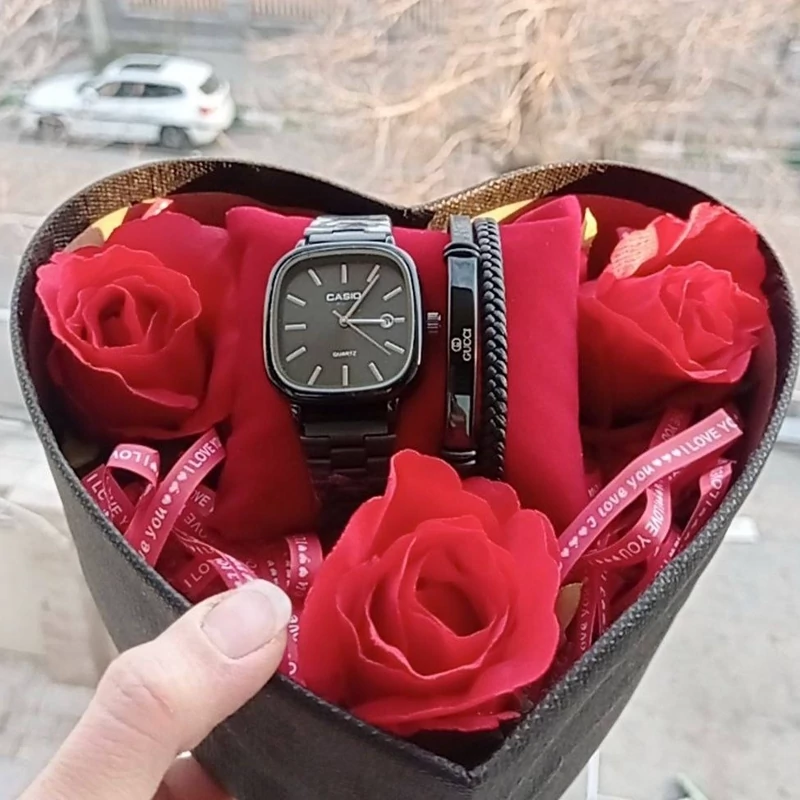 پک کادو مردانه ساعت و دستبند با باکس هدیه و گل