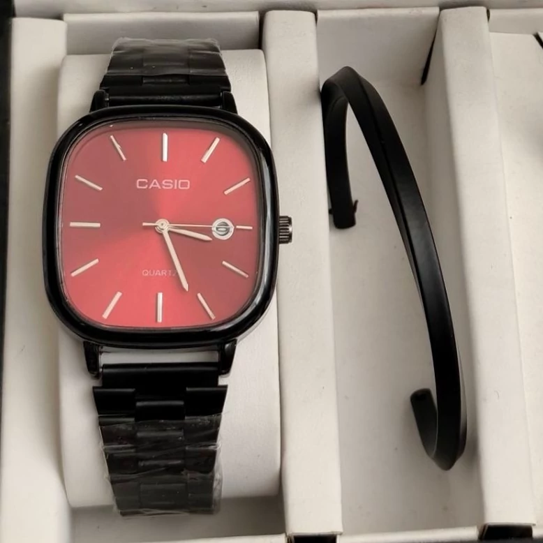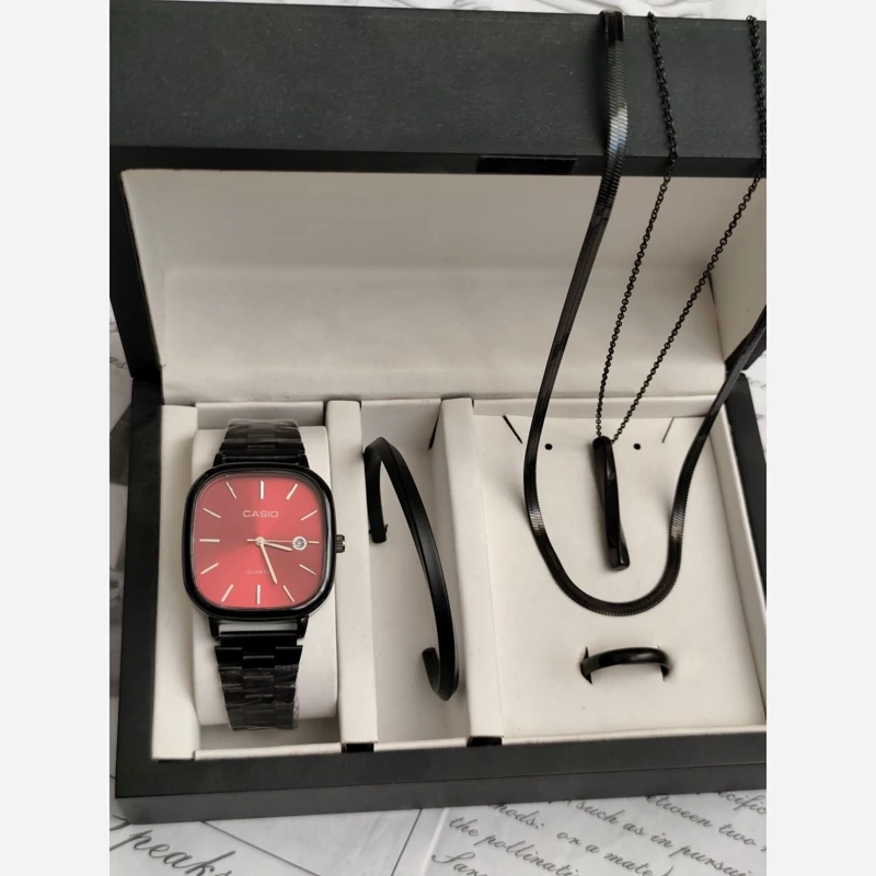 ست مردانه ✅️ ساعت کاسیو اولدمانی کلاسیک ✅️ با تقویم فعال ✅️ بهمراه زیورآلات ( گردنبند ماری و گردنبند پلاک دار و دستبند بنگلی و حلقه ) ✅️ استیل مشکی و رنگ ثابت جعبه کادویی 🎁 و باتری یدکی اشانتیون هدیه ای زیبا برای آقایان شیک پوش