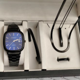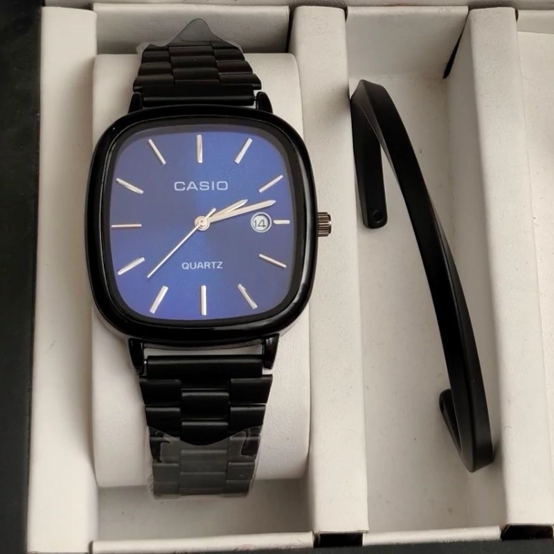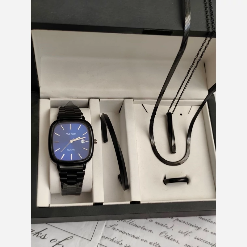 ست ساعت مردانه کاسیو casio اولدمانی مشکی صفحه آبی با دستبند بنگل و گردنبند و حلقه