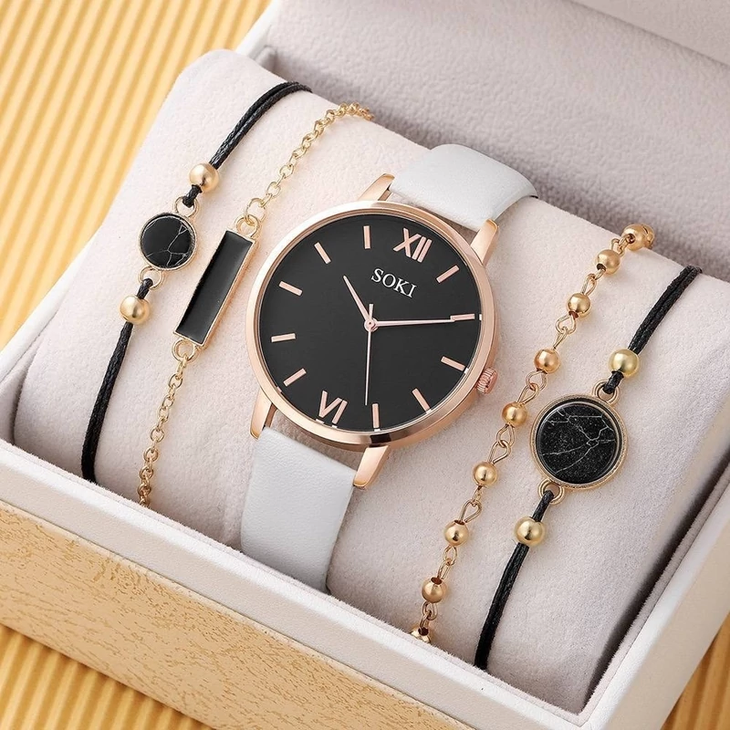 ست ساعت بند چرم مشکی دخترانه زنانه با پک دستبند 4 عددی