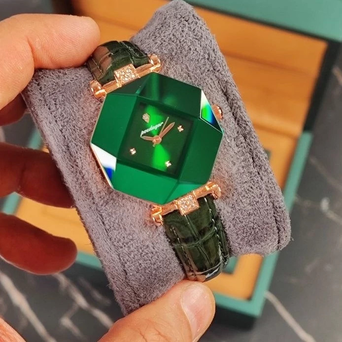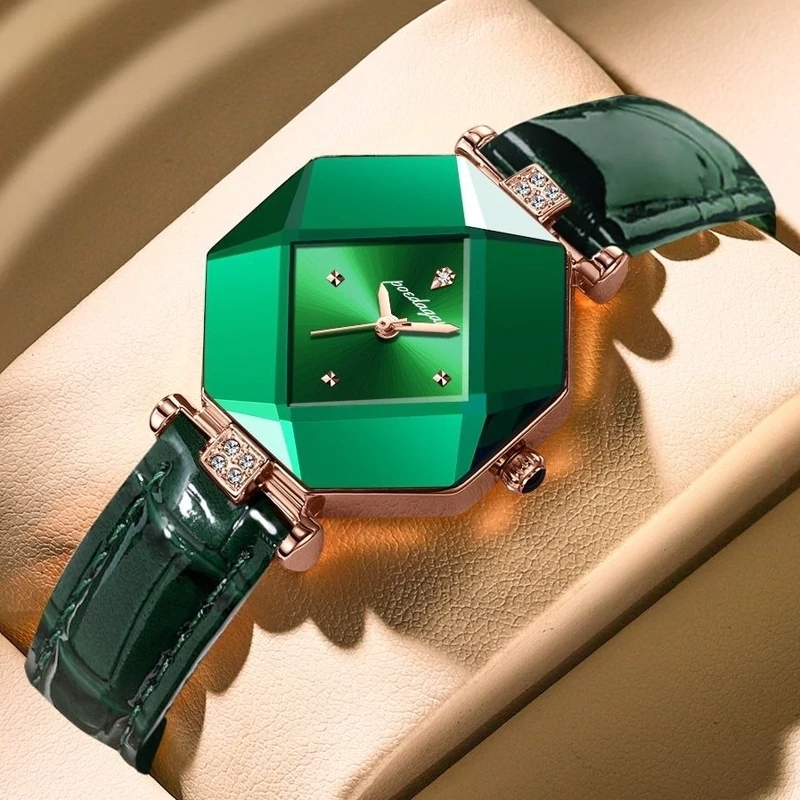 ساعت مچی زنانه پوداگار سبز صفحه تراش با بند چرم poedagar