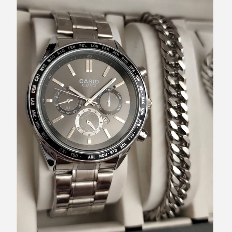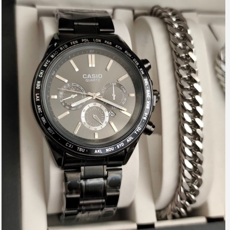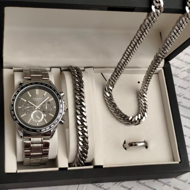 ست ساعت مردونه کاسیو casio با دستبند و گردنبند کارتیر و حلقه استیل
