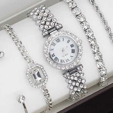 ⌚️ست ساعت و دستبند ✅️ ساعت مچی زنانه نقره ای با بند استیل و صفحه دور نگین جذاب همراه با 4 عدد دستبند طلایی ✅️ استیل و رنگ ثابت ✅️ موتور کوارتز ✅️ قفل دستبندی ستی زیبا مناسب خانم های خاص پسند و شیک پوش همراه با جعبه 🎁 مناسب هدیه