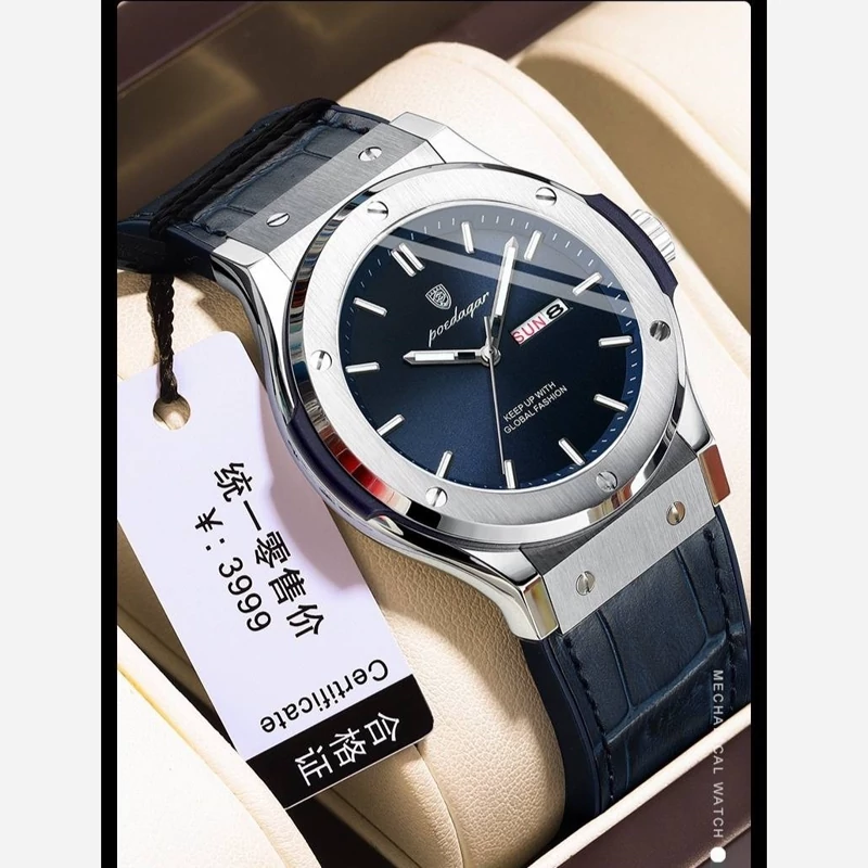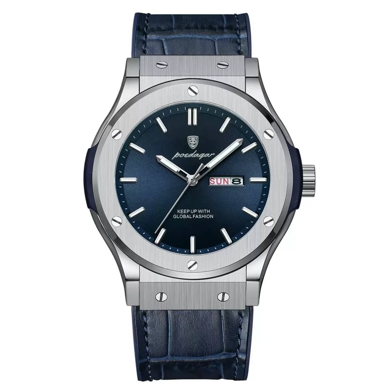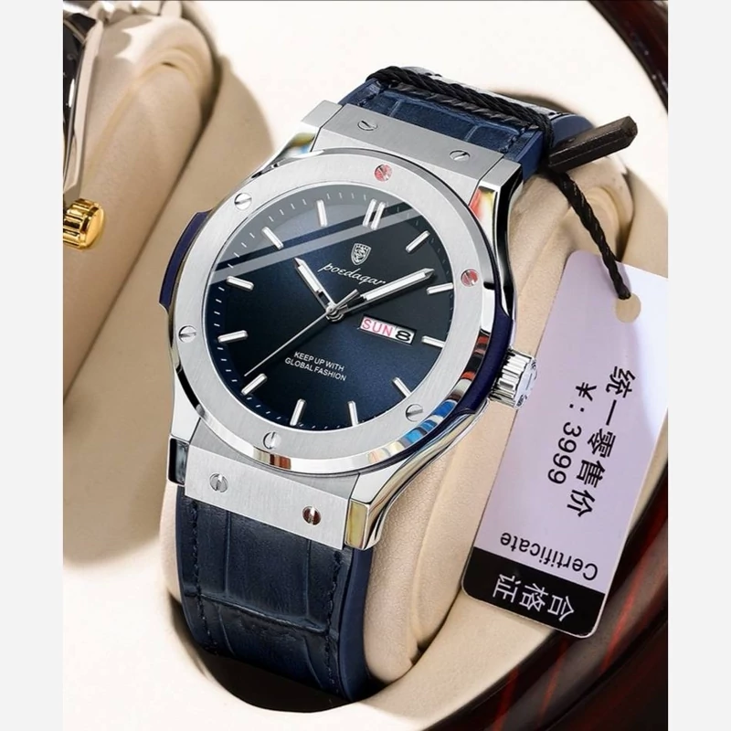 مردانه پوداگار مدل 952 کار جذاب اورجینال از برند پوداگار برند: poedagar مدل: 952 رنگ بند و صفحه سورمه ای قاب سیلور دارای روز شمار دارای شب نما بند جرمی قاب استیل موتور کوارتز قفل سگکی قطر صفحه 42 میل همراه باکس چوبی