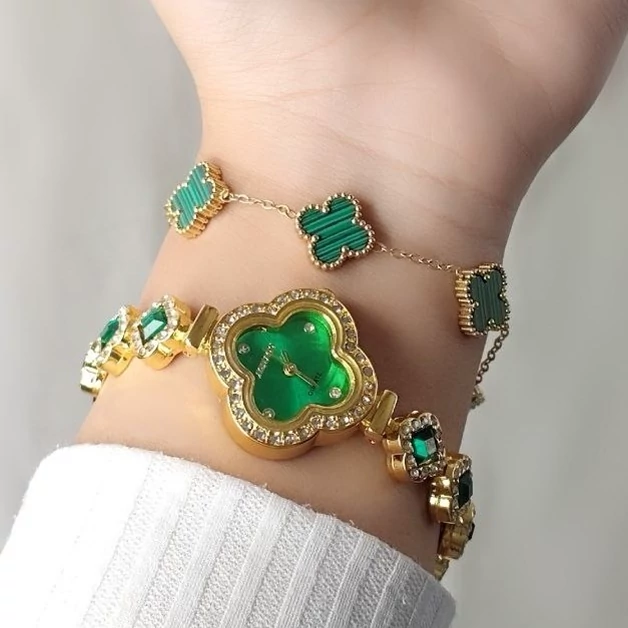 ست ساعت و دستبند دخترانه نگین دار سبز و دستبند ونکلیف