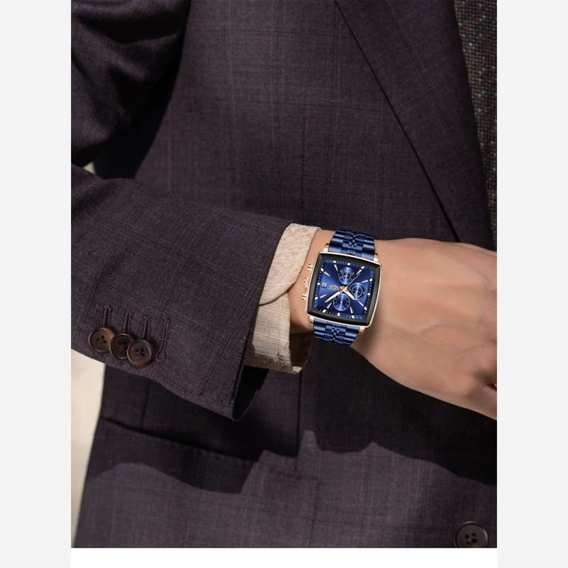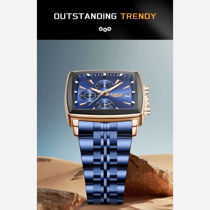 پرفروش ترین مدل مردانه مربعی lige مدل 2025 سه موتوره فعال اورجینال قطر 44 میلی متر رنگ ثابت قاب استیل بند استیل قفل پروانه ای شیشه ضدخش روز شمار دارد ضدآب 3ATM با جعبه مارکدار