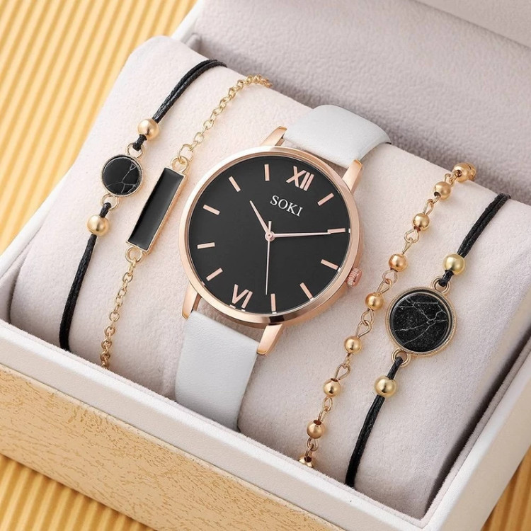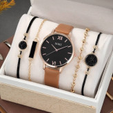 ست ساعت بند چرم قهوه ای دخترانه زنانه با پک دستبند 4 عددی