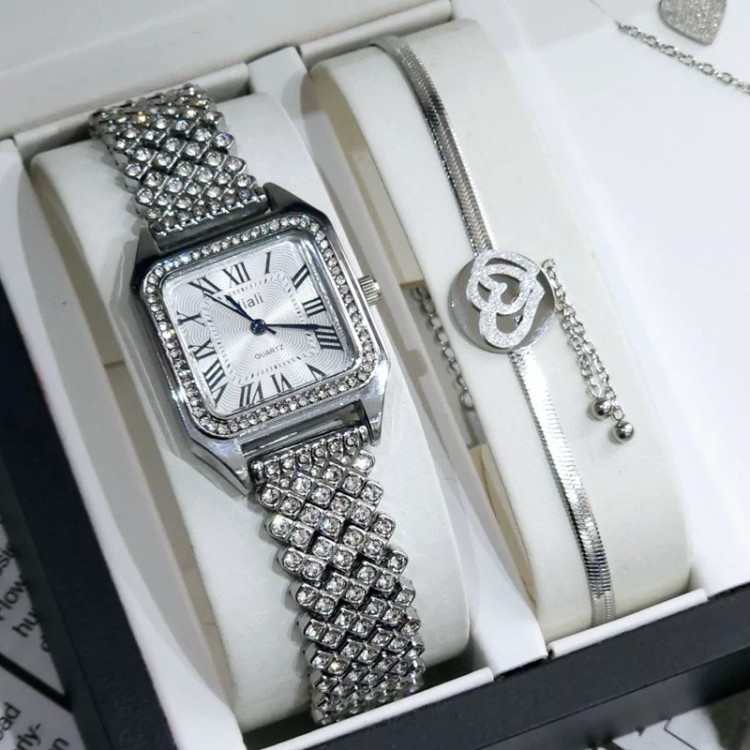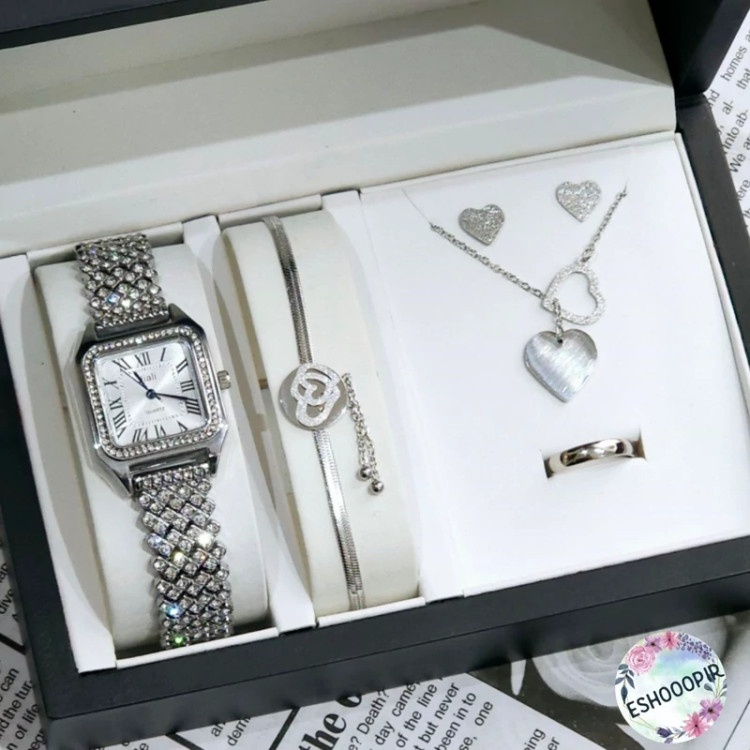 ست ساعت زنانه با دستنبد و گوشواره و گردنبند و انگشتر با ساعت نقره ای نگین دار و ارسال رایگان