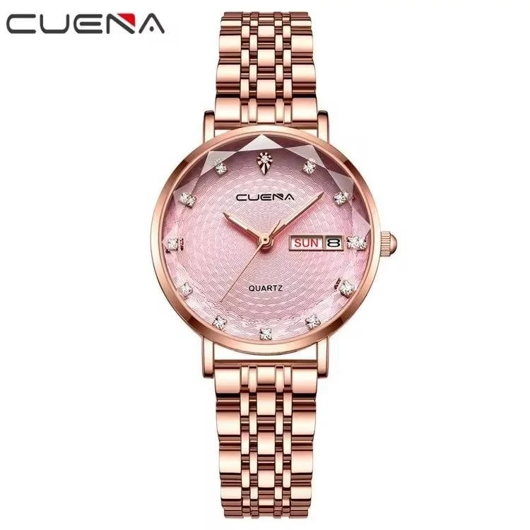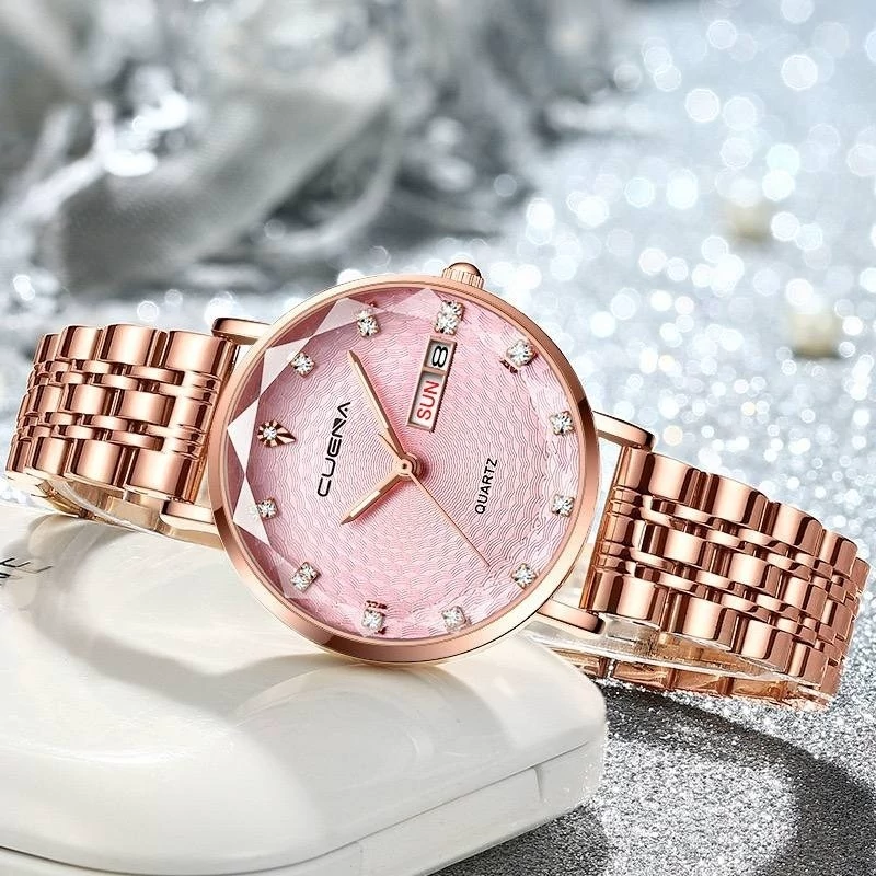 ساعت مچی زنانه اورجینال cuena بند استیل رزگلد صفحه صورتی