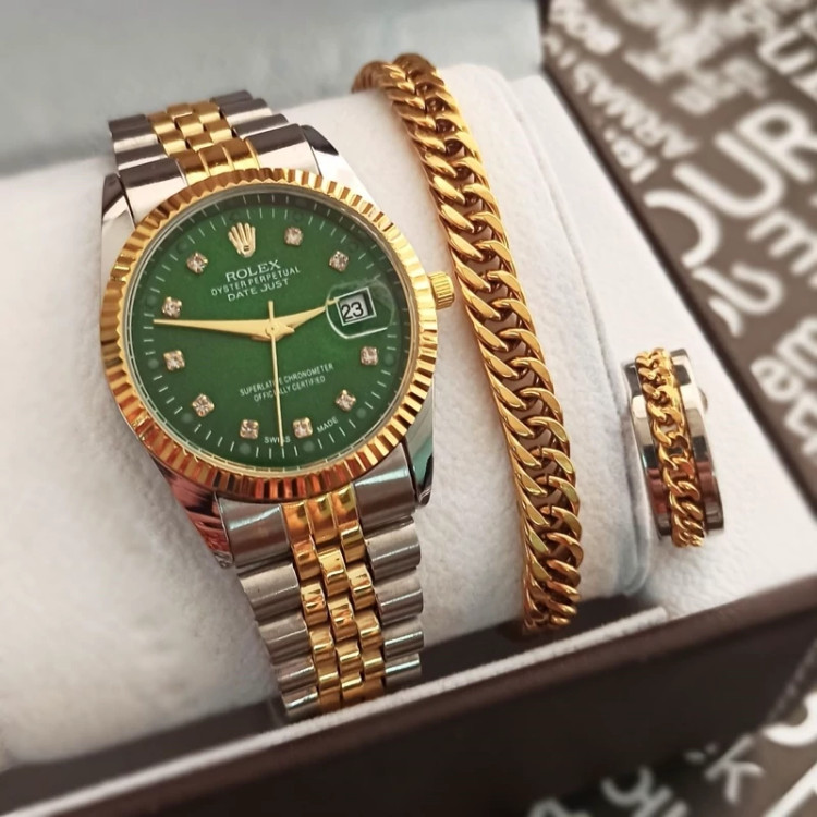 ست ساعت مردانه رولکس طلایی صفحه سبز با دستبند و انگشتر