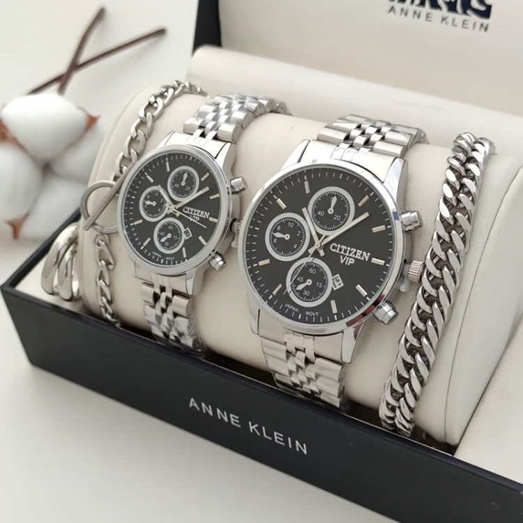 ✅️شامل دو ساعت مردانه و زنانه نقره ای صفحه مشکی برند سیتیزن وی آی پی vip +