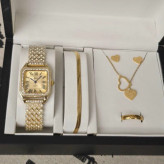 ست ساعت زنانه با دستبند و انگشتر و گوشواره و گردنبند طلایی نگین دار