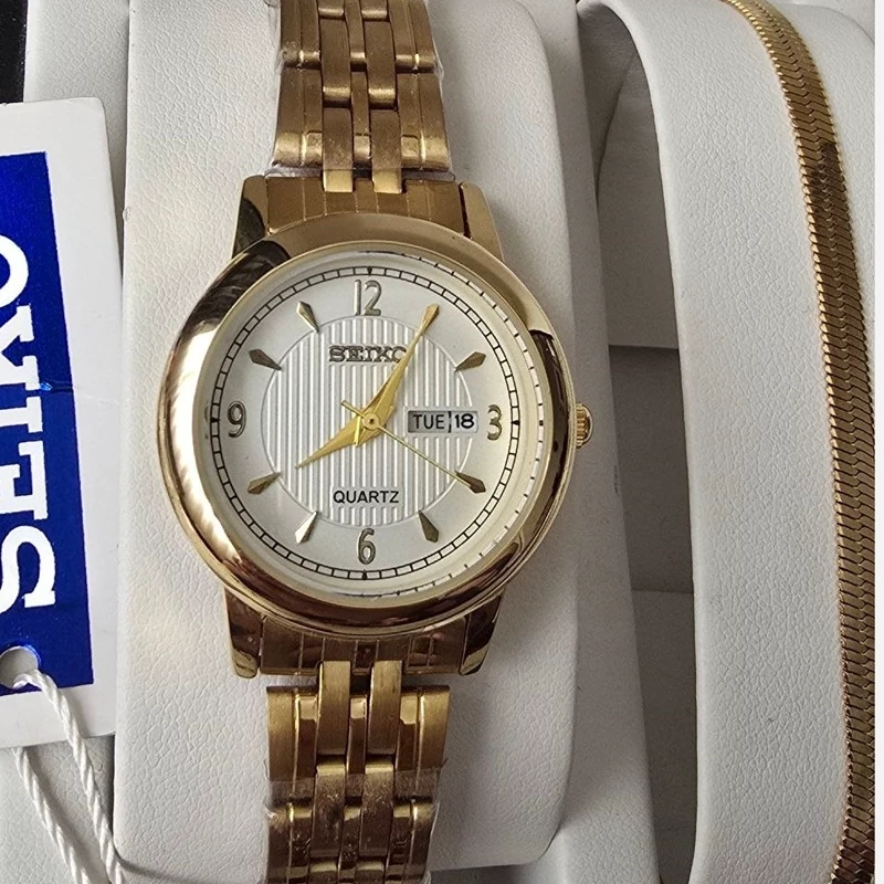 ست ساعت زنانه شامل ساعت مچی با بند نگین دار و دستبند و گردنبند و گوشواره و انگشتر ✅️ استیل و رنگ ثابت ✅️ ساعت در 4 طرح موجود هست و به صورت تک هم فروخته می شود ستی زیبا و با قیمت مناسب برای هدیه دادن به خانم ها 🎁