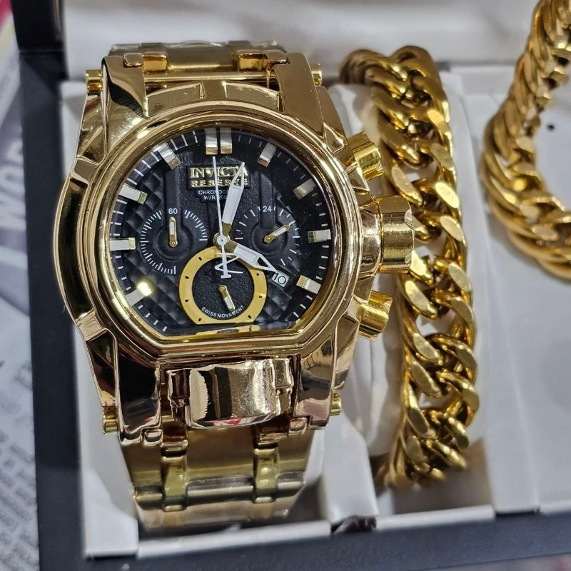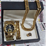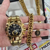 ست ساعت مردونه اینویکتا زئوس با گردنبند و دستنبد استیل طلایی طرح کارتیر و انگشتر مردونه شیر و خورشید