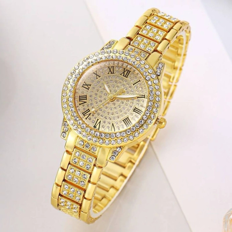ساعت مچی زنانه فول نگین طلایی با بند و صفحه نگین دار