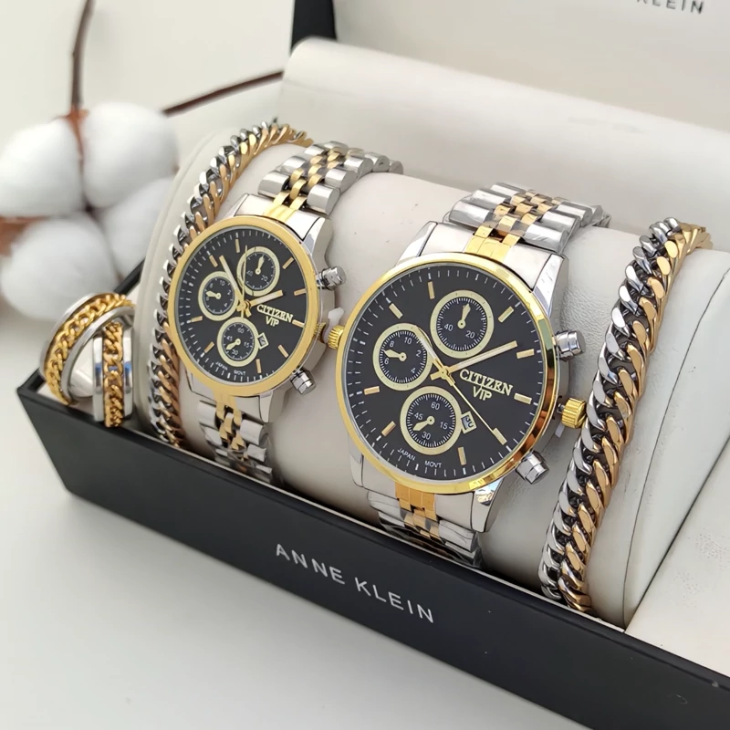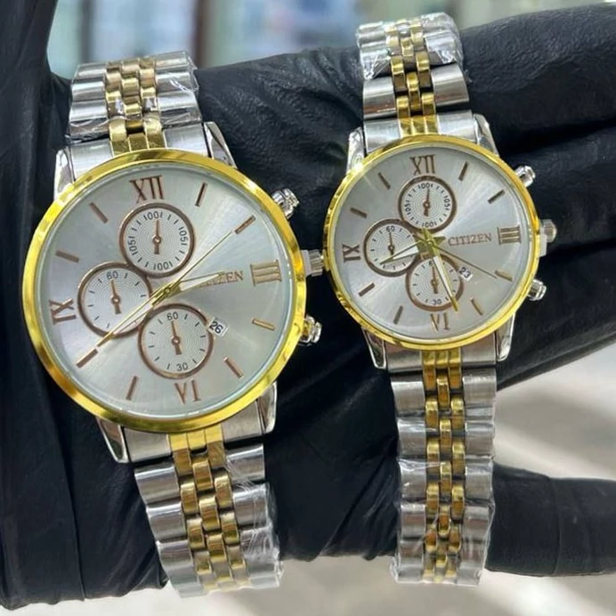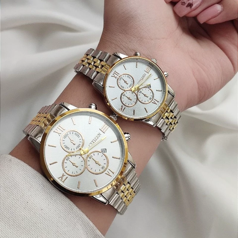 ساعت مردونه و زنونه ست با دستنبد و حلقه ست با بند استیل دو رنگ نقره ای طلایی برند سیتیزن vip