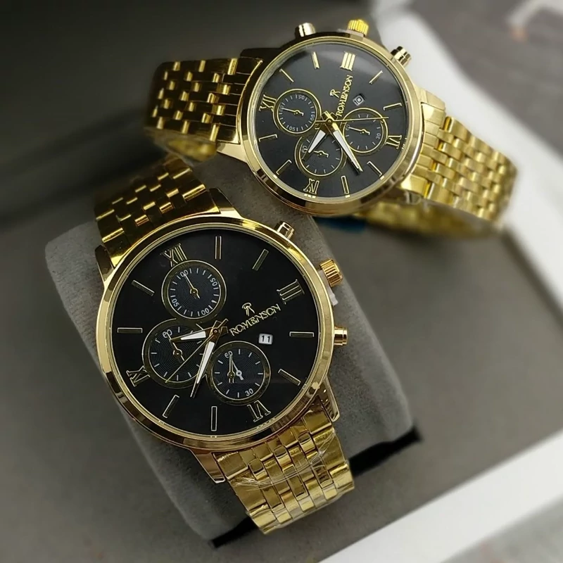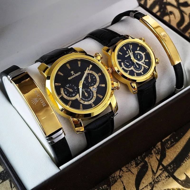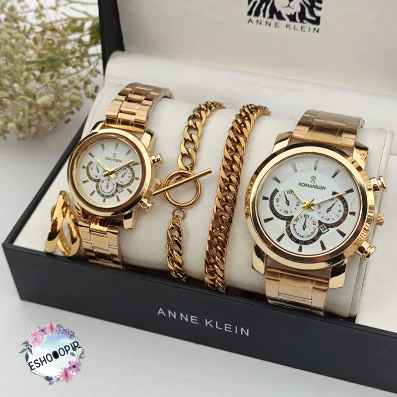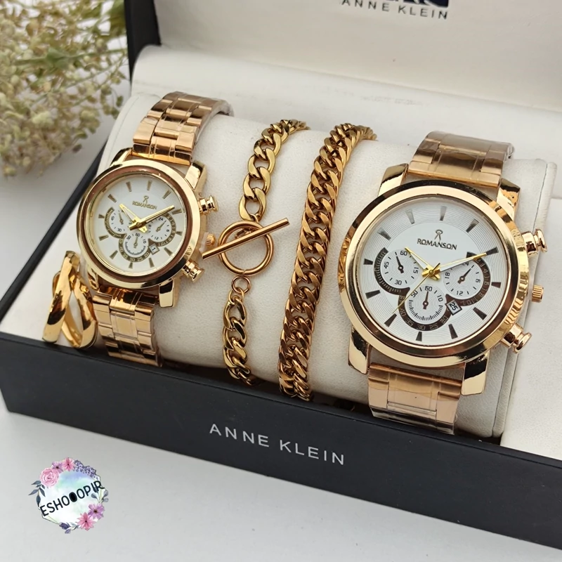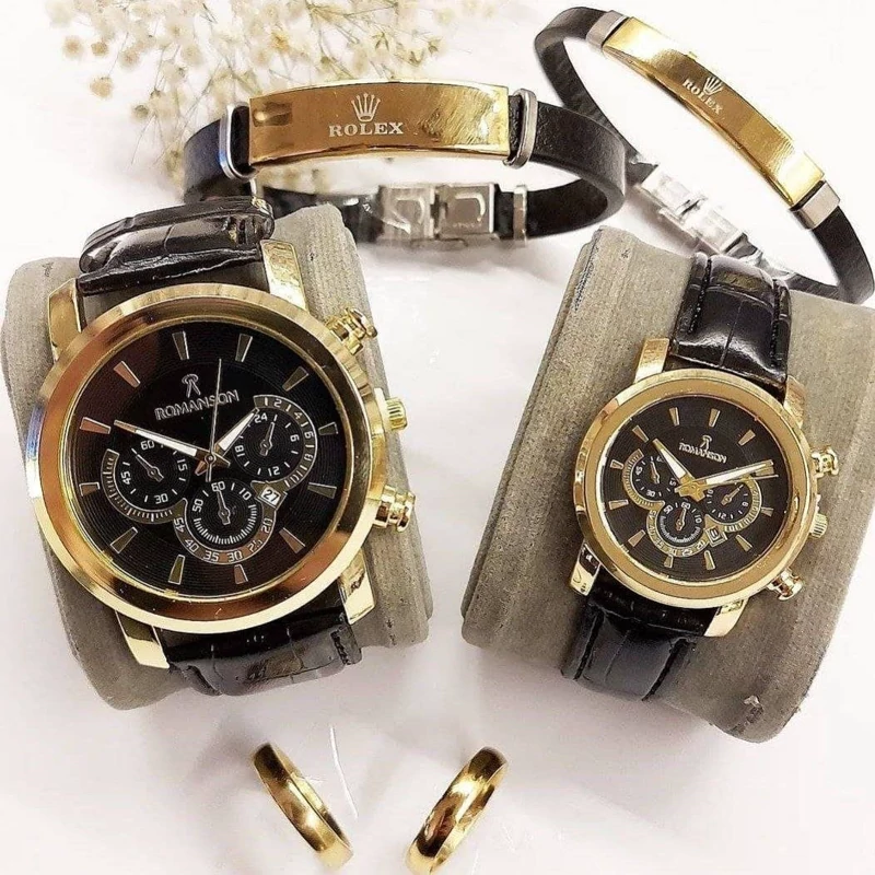 ساعت مردانه و ساعت زنانه ست با دستبند ست و انگشتر طلایی برند رومانسون