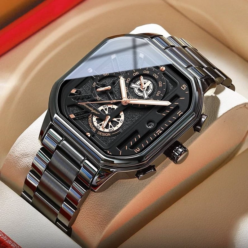ساعت مچی مردانه پوداگار poedagar طرح مربعی با بند استیل طلایی ضدآب عمق بالا
