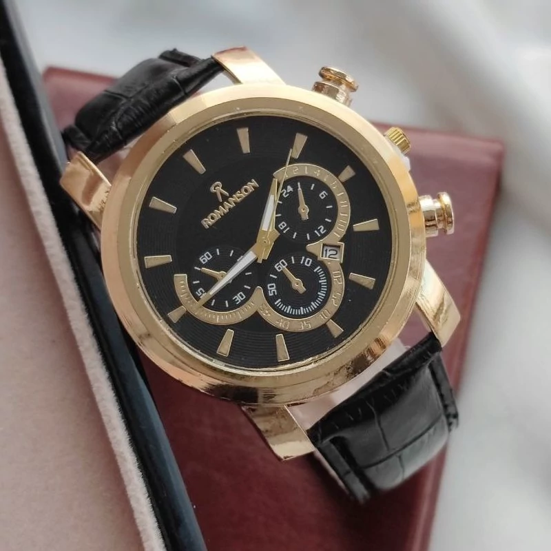 ساعت مردانه رومانسون Romanson با بند چرم و صفحه دور طلایی با تقویم فعال