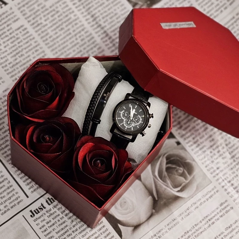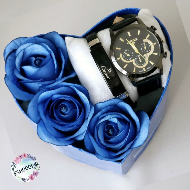 پک هدیه کادو مردانه با ساعت و دستبند و جعبه کادو و گل رز