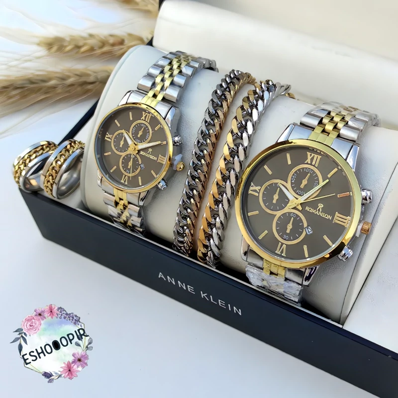 ساعت ست مردانه و زنانه با دستبند و انگشتر برند رومانسون Romansonطلایی نقره ای صفحه تیره